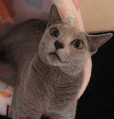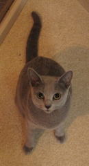 しらんぷりしていると、こんな目線でじーと見られています。ロシアンブルーKyunちゃん、話せたらいいのにね。昨年避妊してから、しっかり太ったような・・・。