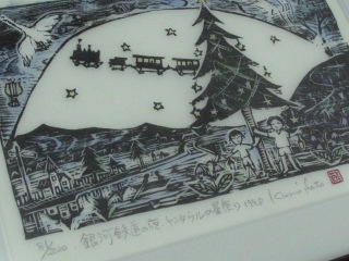 岩手の林風舎から、宮沢賢治の『銀河鉄道の夜』をモチーフに彫った木版画が届きました。作者は佐藤国男さんで、イチイという常緑針葉高木で彫っています。画像には写ってないですが、額縁も手彫りで素敵。まるごと心温まる木版画作品。